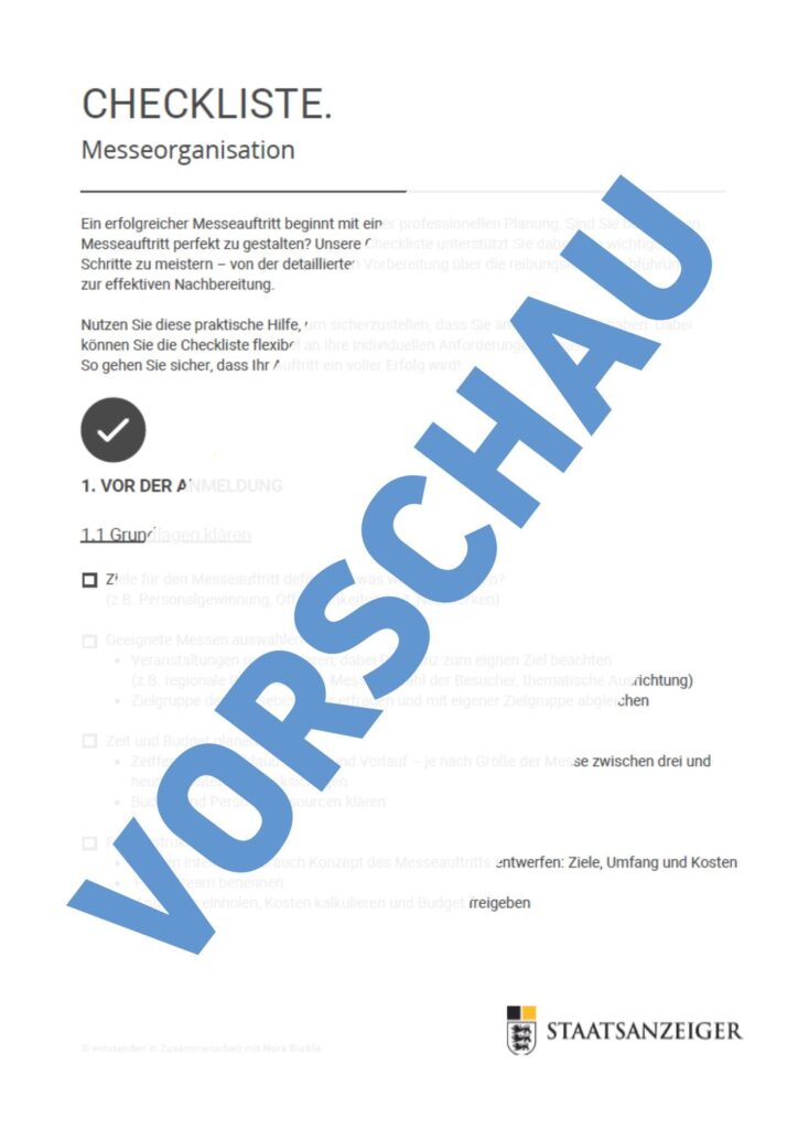 Ein erfolgreicher Messeauftritt beginnt mit einer professionellen Planung. Sind Sie bereit, Ihren Messeauftritt perfekt zu gestalten? Unsere Checkliste unterstützt Sie dabei, alle wichtigen Schritte zu meistern – von der detaillierten Vorbereitung über die reibungslose Durchführung bis zur effektiven Nachbereitung.